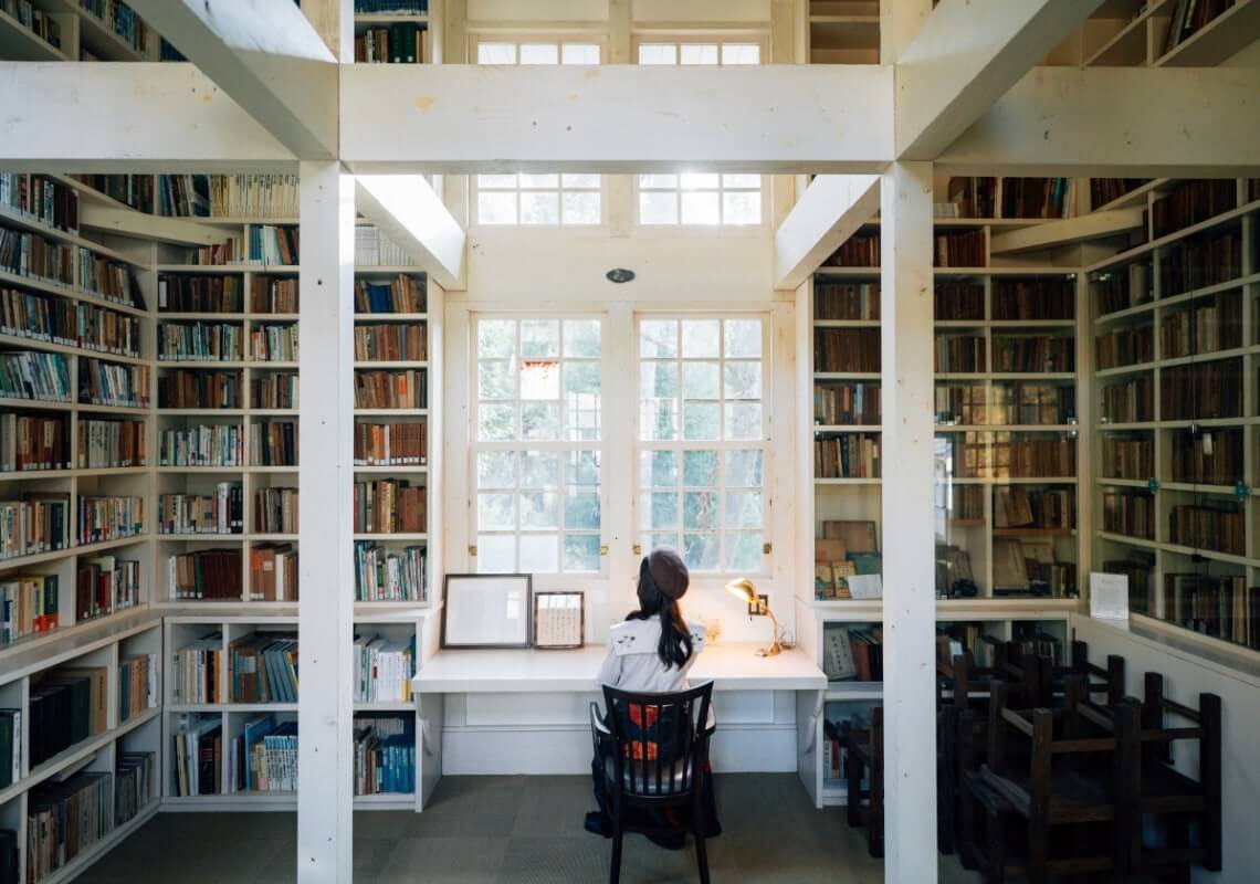 続いては城下町から車で約20分、とってもフォトジェニックな図書館へ! ここはロングステイ型プチホテル「B・B・C長湯」の施設内にある図書館で、どこか海外のような雰囲気が可愛い空間になっています。図書館の他にも、宿泊施設があるので、宿泊をしてゆっくりと過ごすのもおすすめです。
