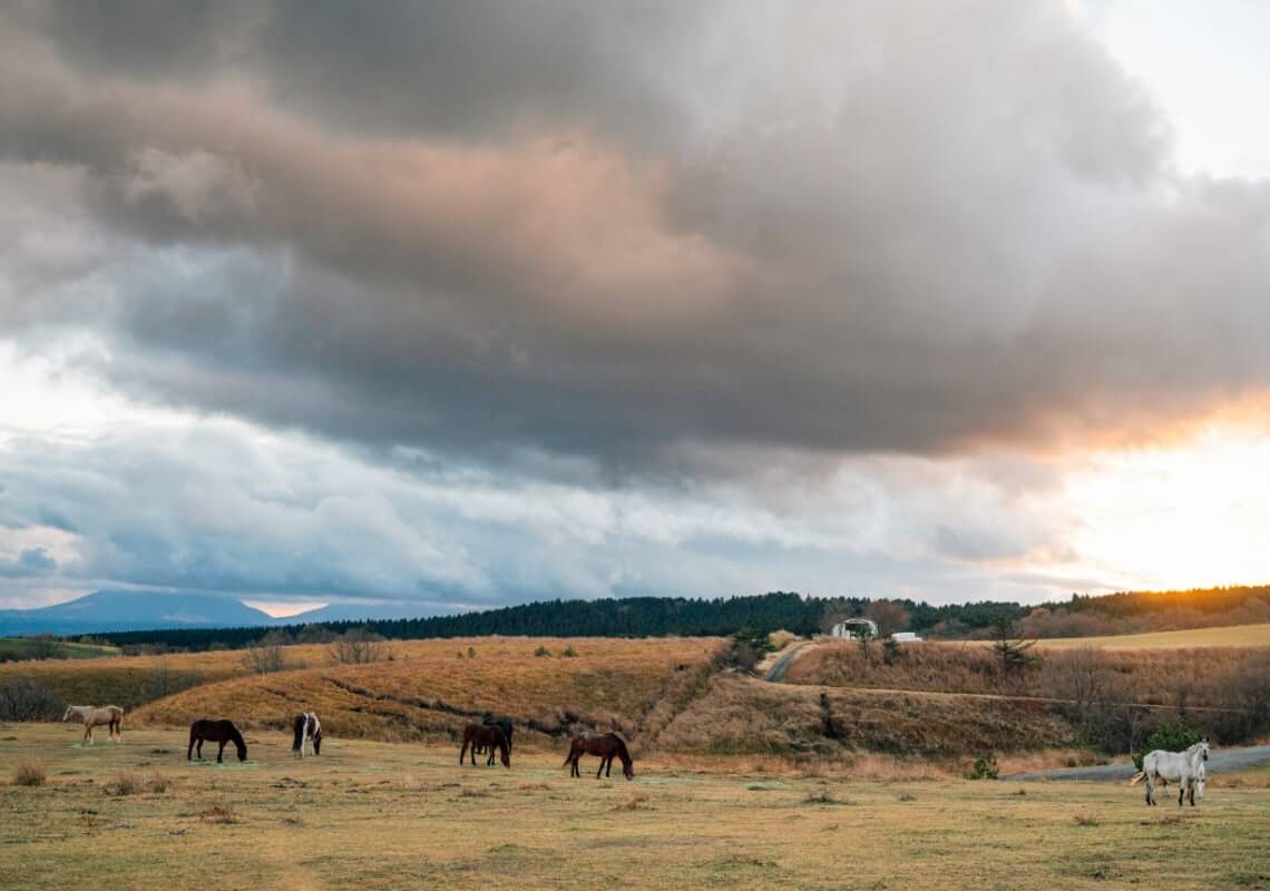 続いては久住高原エリアへ! まず訪れたのは、『ココペリ ウエスタン ライディングパノラマ放牧場』。ここは広大な絶景と、放牧されている動物たちの写真が楽しめる絶好のフォトスポット。夕日が綺麗な時間帯がおすすめです。