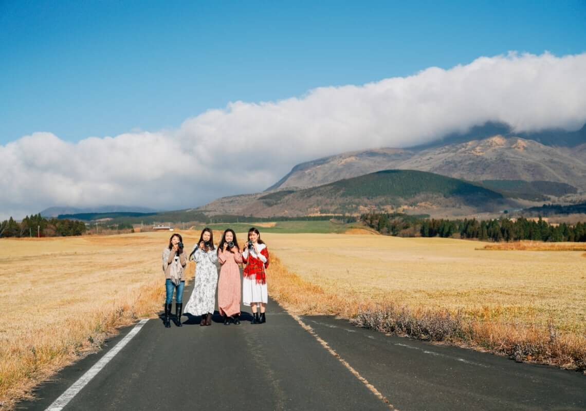 久住滑空場、実はバイク好きさんや車好きさんには有名な場所。なぜかというと、どこまで伸びる一本道!そして抜けのいいフラットな草原!愛車撮影スポットとして最適なんです。そんな抜けのいい場所、私たちカメラ女子だってテンション上がらないわけがない!遠くに見える山を入れてみたり、逆光を使った写真などいろんな撮影が楽しめますよ。