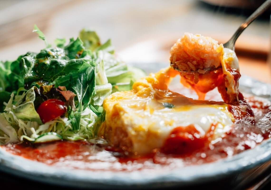 喫茶店は減農薬・有機栽培の竹田市荻町産のミニトマトで作る「特製オムライス」と「特製豊後牛ハンバーグ」が大人気!木造の店内はログハウスのようでとっても落ち着きます。