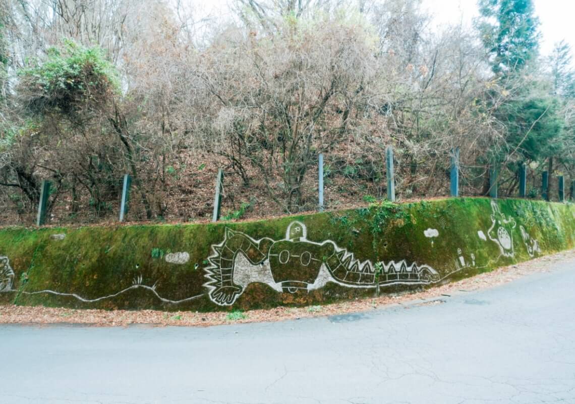 『筋湯(すじゆ)温泉』の近くの苔アート。苔の生えている壁を削ってジブリのキャラクターが描かれています。道幅が狭いところが多いので、撮影の際は車に気を付けてくださいね。