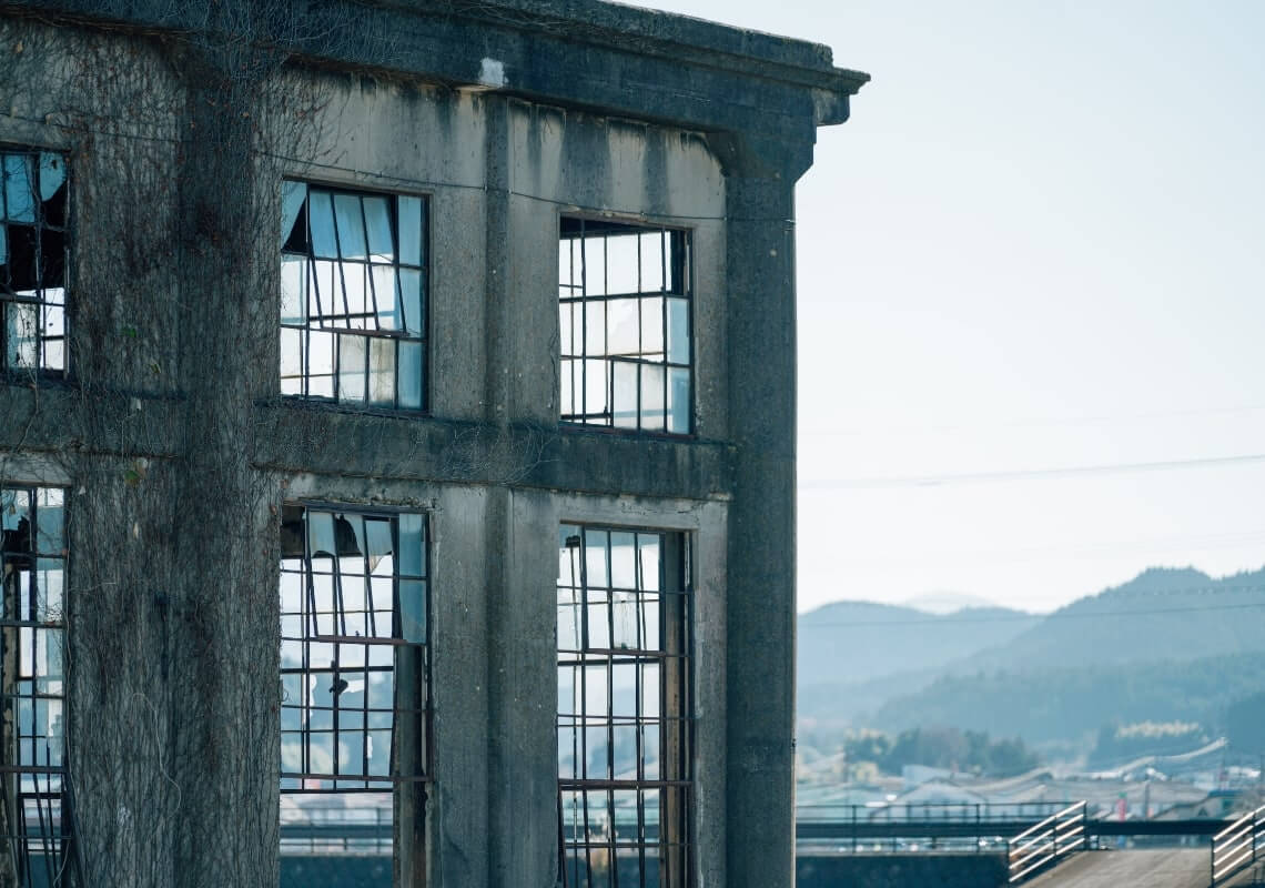 「キューロク」という愛称で親しまれた機関車、扇型機関庫と転車台が残っている、鉄道の歴史を残す公園です。扇型機関庫は窓ガラスが割れていたりして廃墟感が漂っていますが、この機関庫は現存するものとしては九州で唯一のものなんだそう!扇型の建物、そこに差し込む光はとってもフォトジェニックでした。