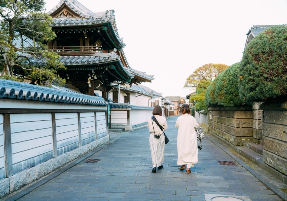 臼杵城から南西のエリアは今でも城下町の景観が残っています。白壁と雨が降った後の濡れた石畳は雰囲気バツグン!この辺りは阿蘇山の火山灰が固まってできた凝灰岩の丘で、その岩を削って道を通しているのですが、特に『旧真光寺』の前は「切り通し」と呼ばれ、臼杵を代表する景観のひとつなんですって!