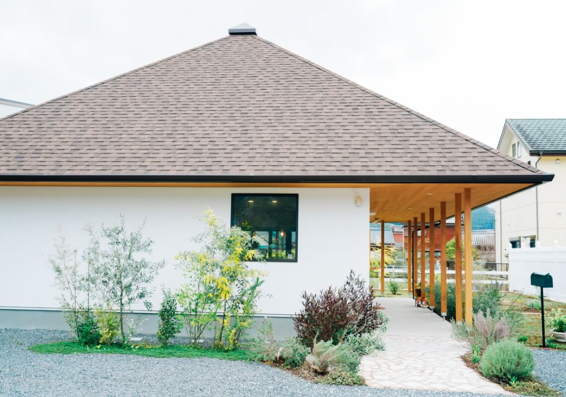 三角と四角のシンプルなシルエットが可愛い建物のカフェ! 真っ白な壁と白木を使った韓国風の内装がとってもオシャレ。手作りにこだわったスイーツやドリンク、8種類のスパイスを使用した「スパイスチキンカレー」などが楽しめます。シーズンには、農家から直接仕入れたフレッシュないちごがかわいいパフェ、タルト、ドリンクに変身!