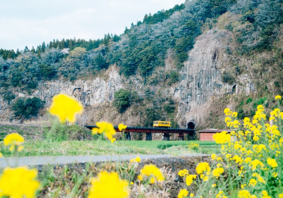大野川と奥岳川が合流する場所に、突如高さ50m長さ500mにわたる岩戸(いわど)と呼ばれる大絶壁が!その岩壁をくり抜いたトンネルから、赤や黄色の列車が飛び出してくる姿がとっても不思議。実はここ、鉄道ファンには有名な場所なんだそうですよ。