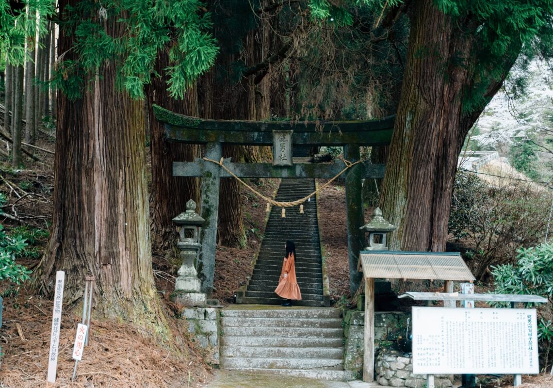 階段状の参道の両側には樹齢300年を超える杉の木がそびえ立ち、なんとも雄大な姿を見せてくれます。参道を上っていくと、歴史を感じる木造の拝殿と風の神様を祀った本殿が現れます。境内の澄んだ空気に心も洗われます。健男社を包む杉などの自然林は県指定天然記念物で、神殿の背後にはモミの巨木がある自然林が残されています。