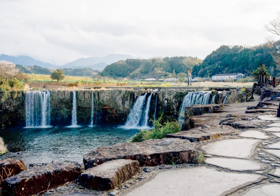 田園地帯に突然滝が現れるという、珍しいスポット。滝の前には吊り橋がかかっていて迫力のある姿を正面から見ることができたり、滝の上から滝つぼを見下ろせる散歩道、崖のふちまで近付けるスポットもあります。滝の上流にある鳥居は『緒方三社』のうちの『二の宮社』の鳥居で、毎年の川越しまつりの際に神輿がここをくぐるそうです。日本の滝100選にも選ばれています。