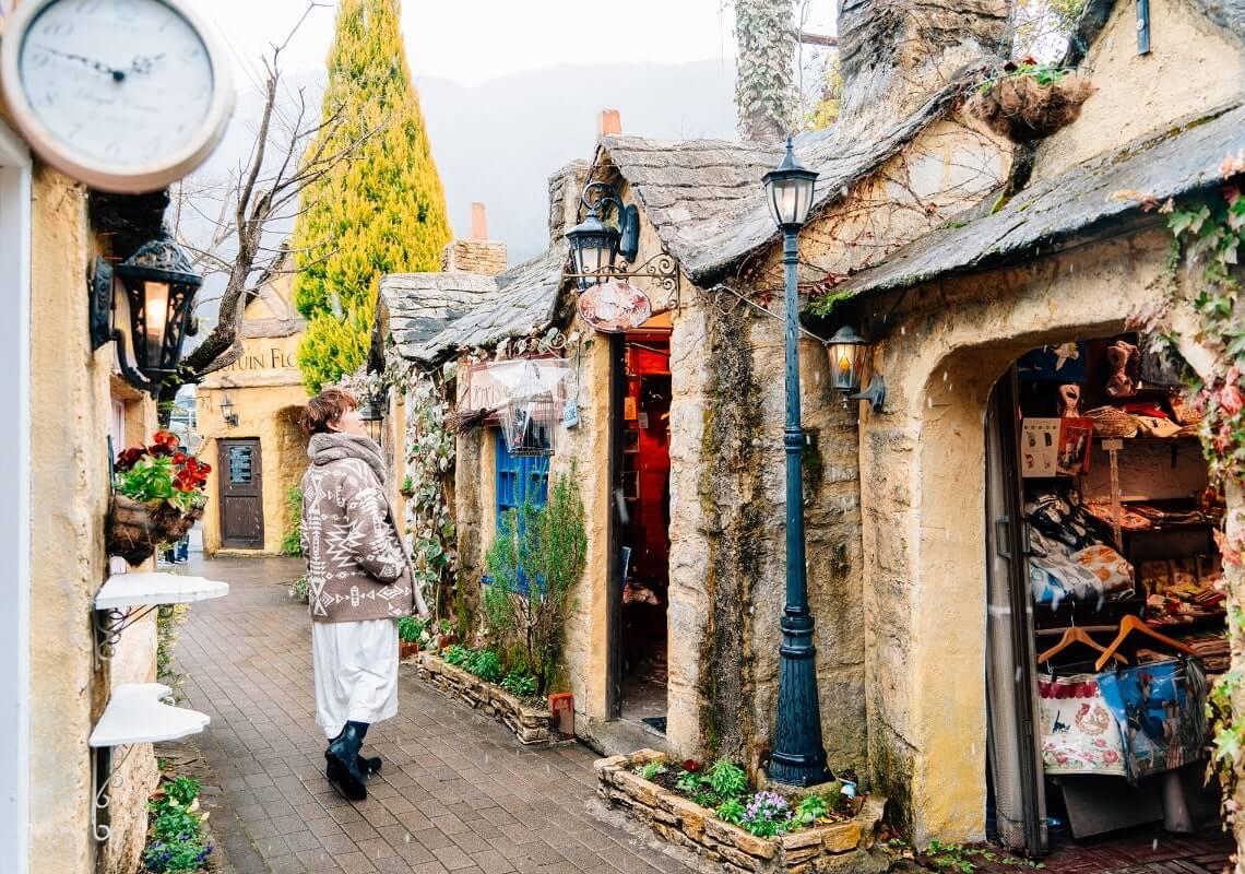 世界一美しい村といわれるイギリス・コッツウォルズ地方の蜂蜜色のコッツウォルズストーンの街並みを再現した施設。ぐるりと円を描くように散策路があり、その両側に可愛いショップがいくつも並んでいます。小さい施設ですが、両側を可愛いお家に挟まれているので没入感は抜群です!思わず大分にいることを忘れそう!?