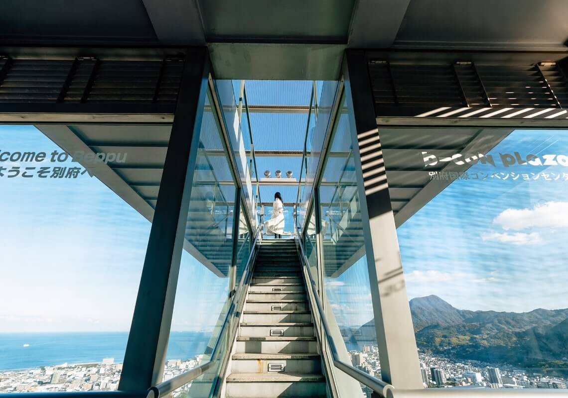 大分県出身の建築家、磯崎新設計のビーコンプラザ(別府国際コンベンションセンター)のシンボルタワー!円柱状の2本の支柱と、まるで船の帆のように弧を描いた支えの部分で構成されています。地上100mにある、空に迫り出したガラス箱のような展望室からは別府市内や海、鶴見岳などを一望することができ、夜には「日本夜景遺産」に認定された別府の街を見ることができます。