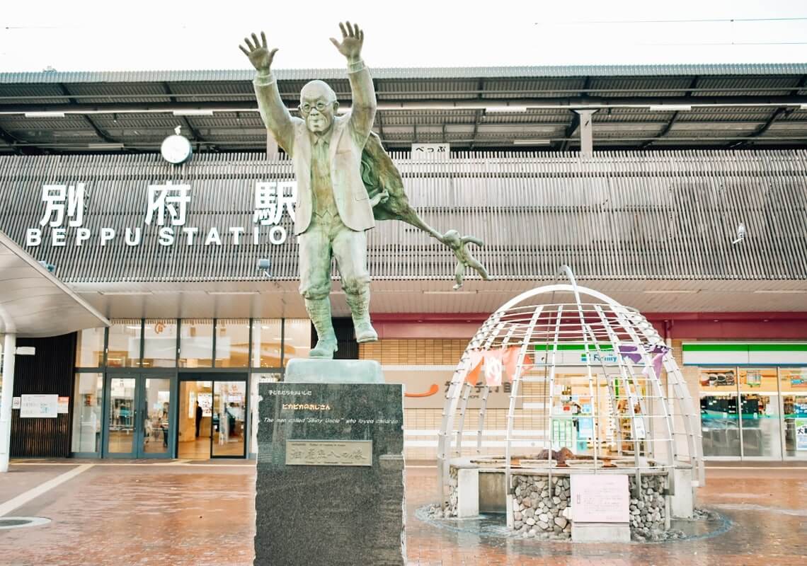 『北高架商店街』はレトロな商店街のお店や壁にアートがたくさん!100年以上の歴史がある竹瓦温泉は『唐破風(からはふ)造り』の豪華な屋根が特徴で、そのレトロな外観が魅力的!「別府観光の父」と呼ばれるとってもスゴイ人、油屋熊八のブロンズ像。でもなんでこんなポーズ?思わずパチリ。「日本一の温泉湧出量」を誇る別府にふさわしく『手湯』がありました!