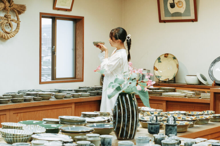出雲に伝わる技法をもとに今の暮らしに合わせた器を中心につくる「袖師窯」へ向かいます。尾野友彦さんは現在五代目、145年の歴史を持つ歴史ある窯元です。時を感じる趣のある木造の建物の中には黙々と作業をしている職人さんたち。作業場内を照らすオレンジ色の明かりが、なんとも優しい雰囲気を醸し出して、人の温かさや器に込められた思いまで伝わってきそう。間近でこんな作業を見ることができるのはとっても珍しいですよね。丁寧に作られた器は建物の2階に展示され購入することもできますよ。