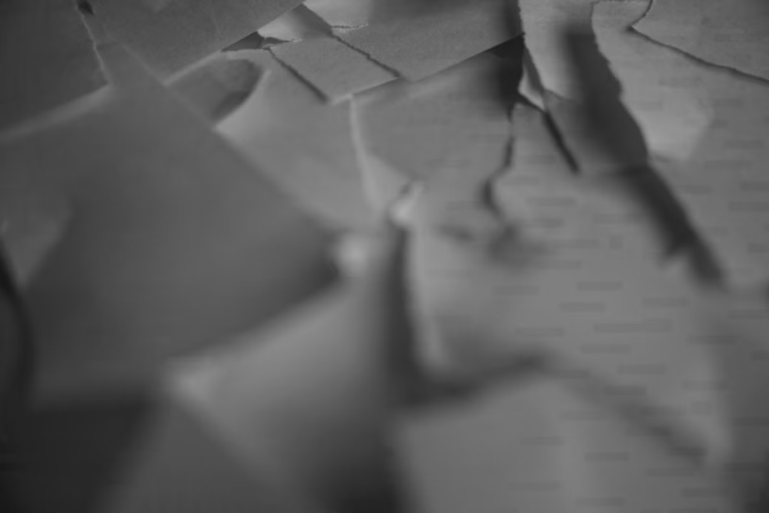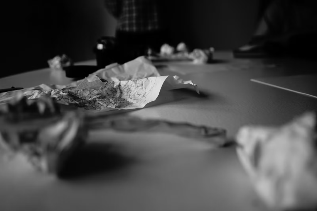 みんながぐしゃぐしゃにした紙が机の上に散らばっていて、それをモノクロで撮っただけで、なんとなくいい感じに見える、モノクロ力すごい!