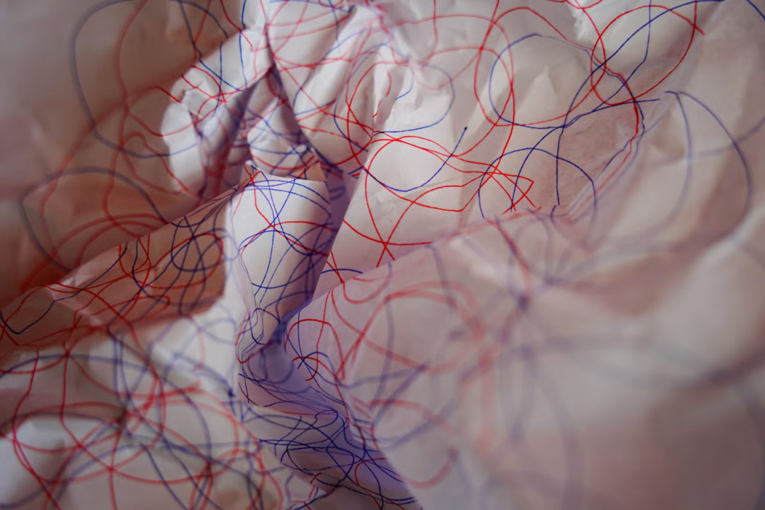 持っていた赤と青のボールペンでぐるぐるを書いてくしゃくしゃにしたり