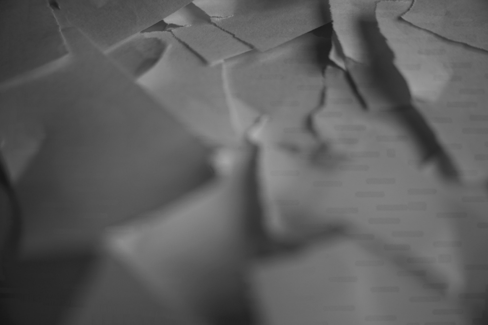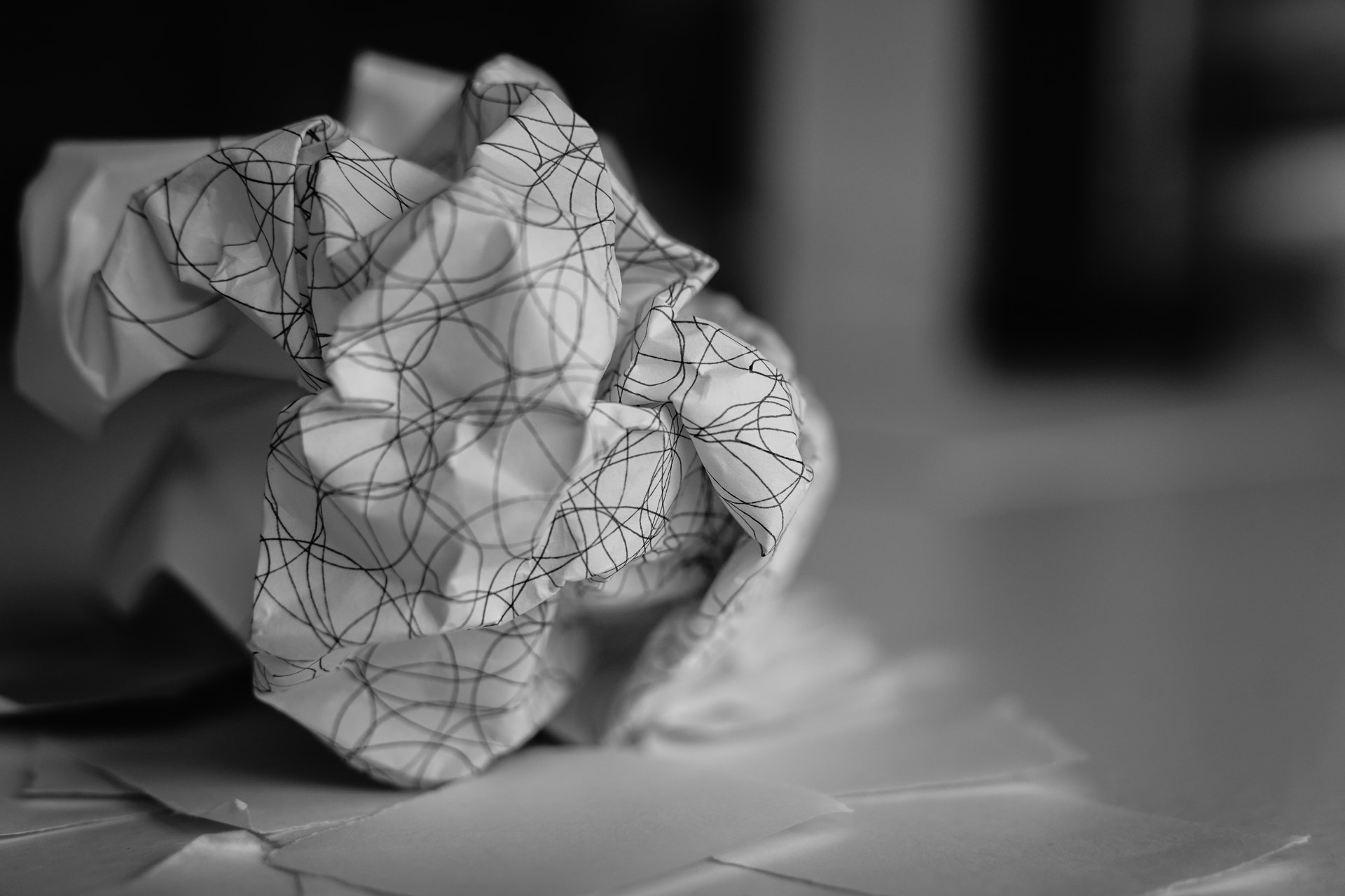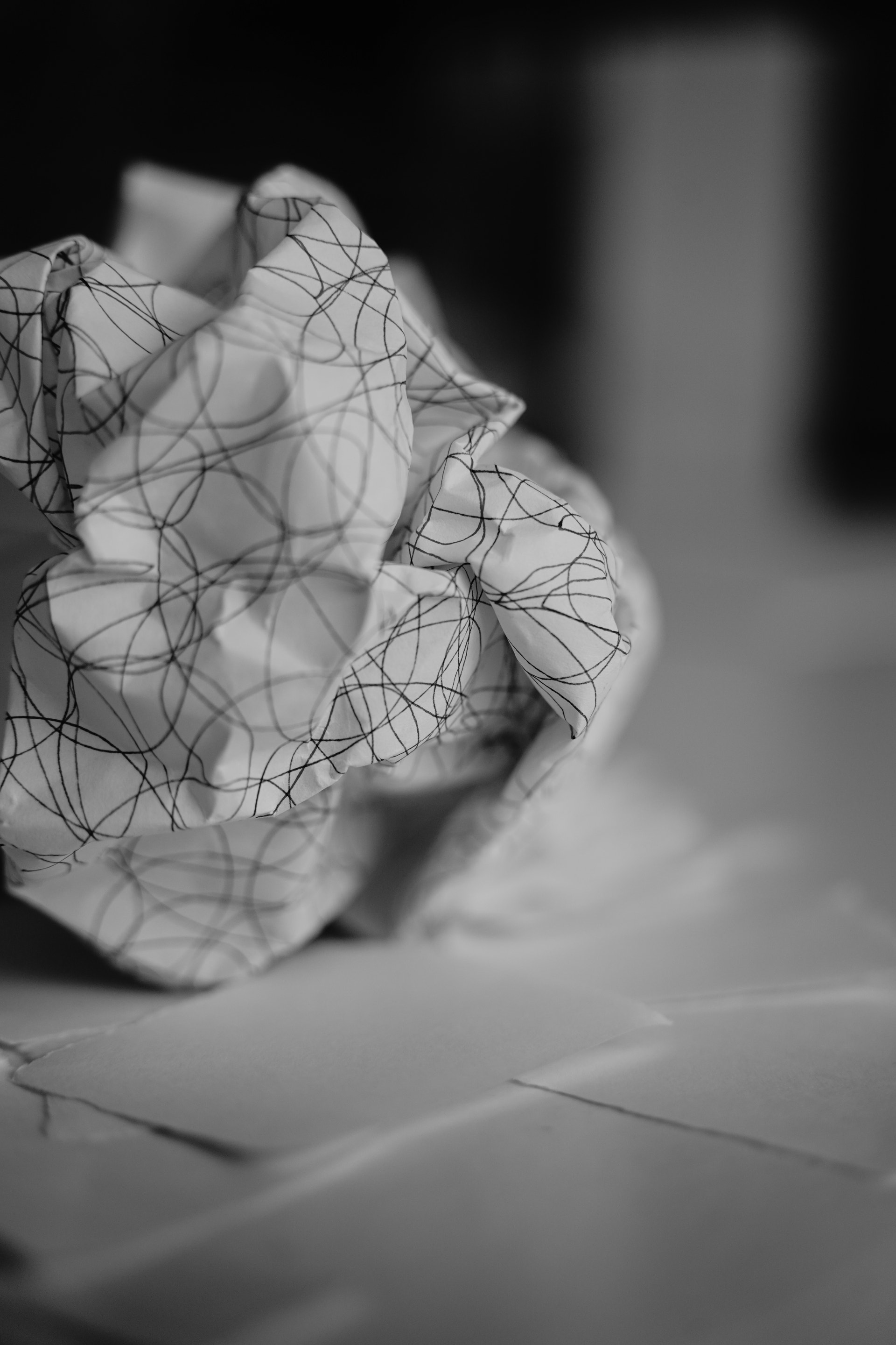 みんながぐしゃぐしゃにした紙が机の上に散らばっていて、それをモノクロで撮っただけで、なんとなくいい感じに見える、モノクロ力すごい!