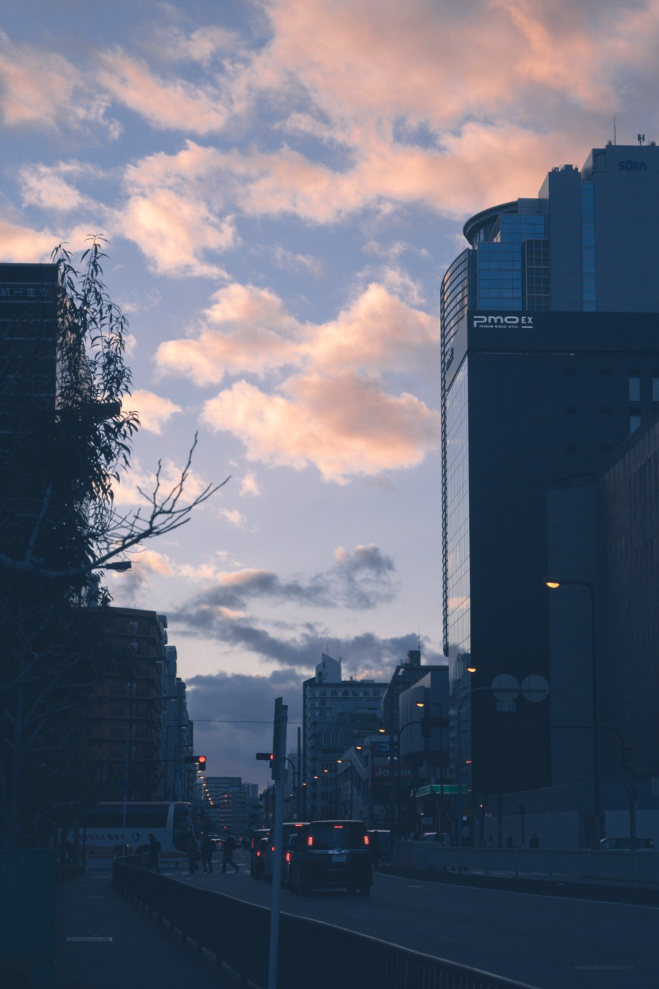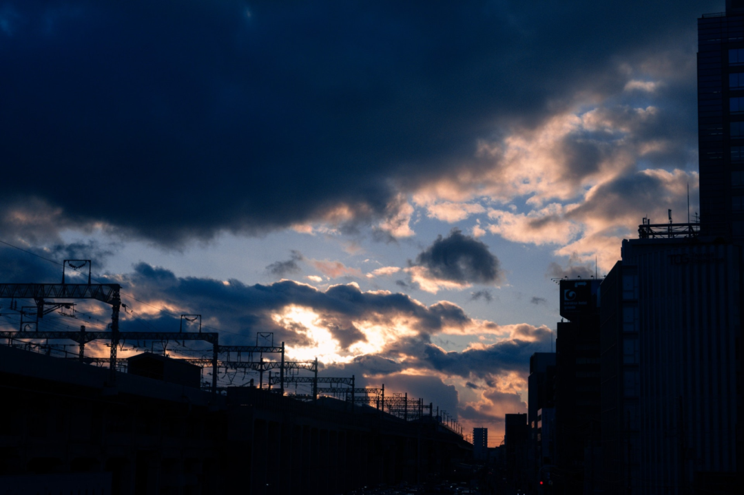 夕焼けの光と、その日はお天気が少し曇っていたので、灰色がかった雲がもくもくとしていて、それらのグラデーションの色味や、