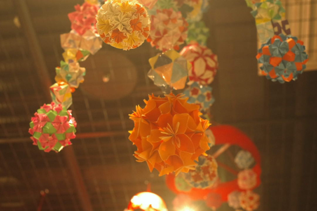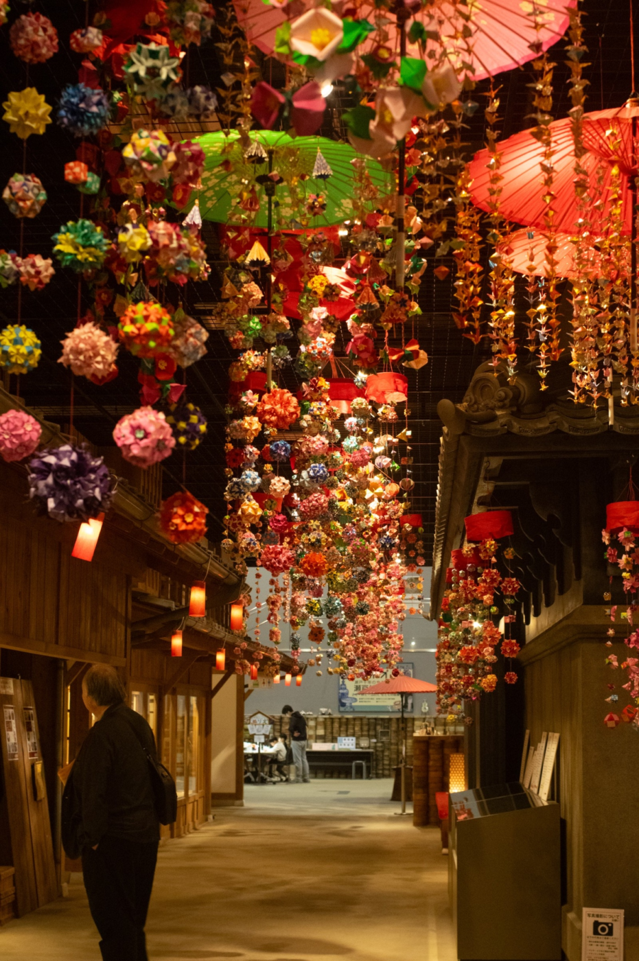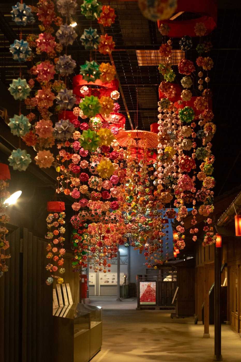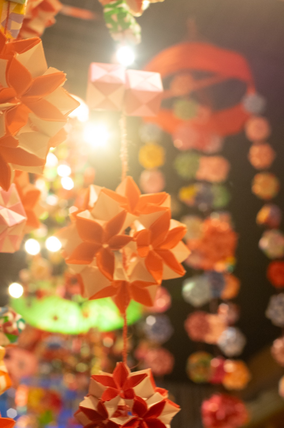 せとものの展示を見て通路に出ると、折り紙で作られたつるし飾りが飾られていた。屋内なのに、まるで絶え間なく色とりどりの花びらが降ってくるような、そんな圧倒的な風景だった。