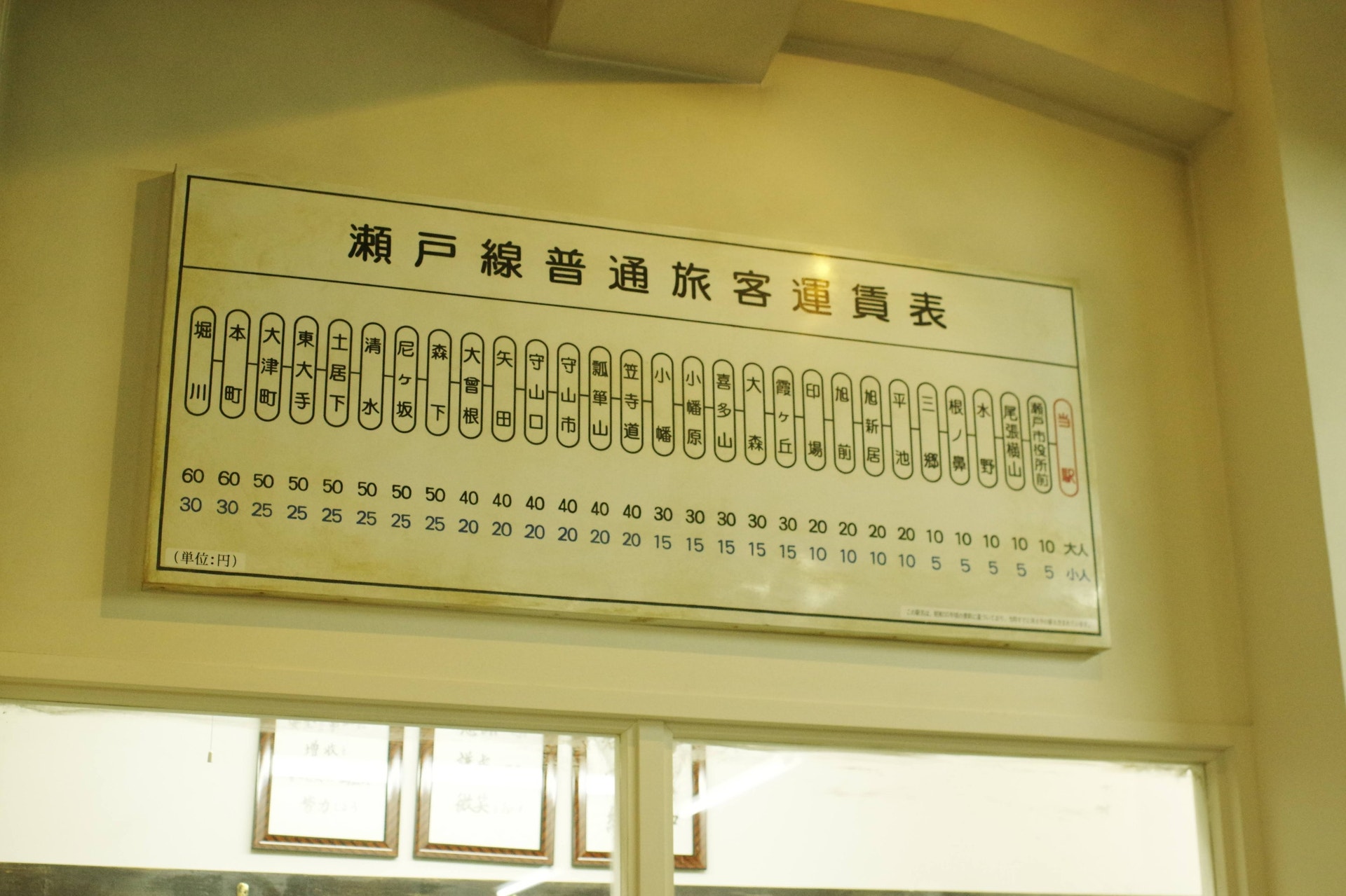 復元されている駅舎と当時の運賃表に見入ってしまう。名古屋市守山区がまだ守山市だったり、終点が栄町ではなく堀川だったり、昔の「お堀列車」「瀬戸電」と呼ばれていたころの姿に近いのかな。