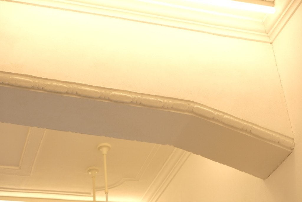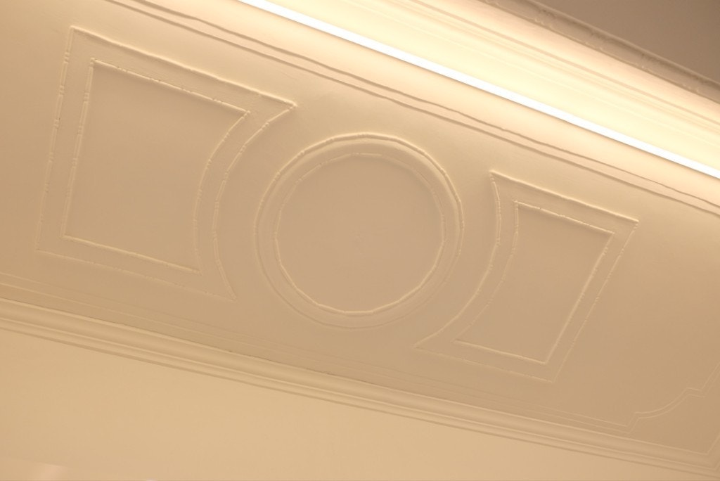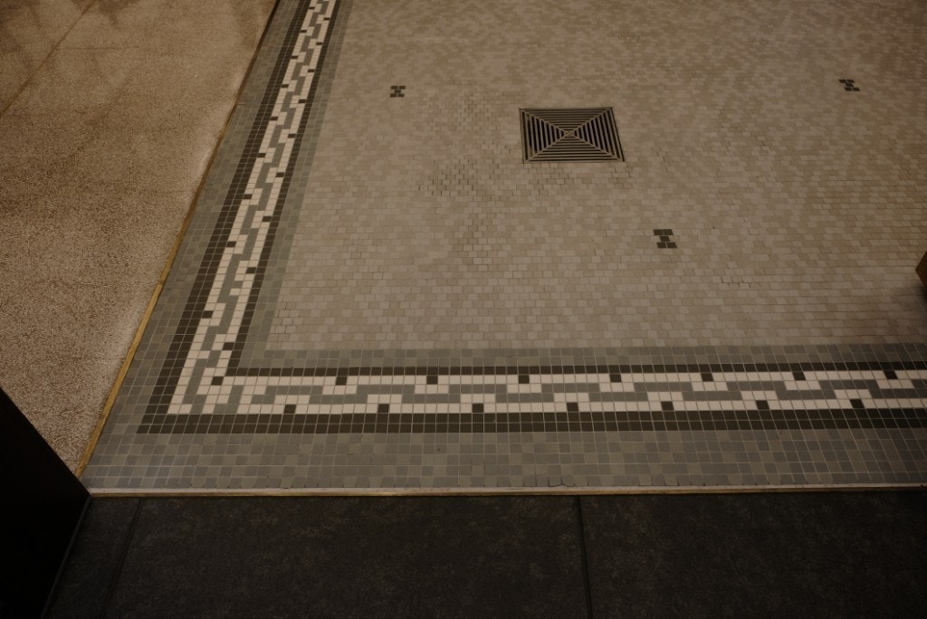 天井のレリーフ、外観の壁、足元のタイルに、建て替え前の面影が残っていました。歩きながら探すのも楽しい空間です。