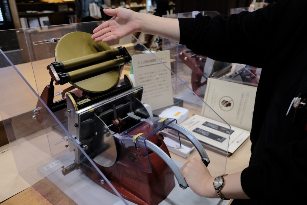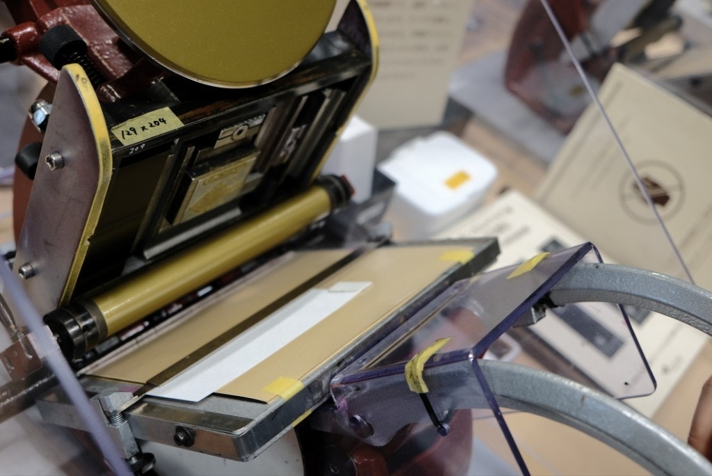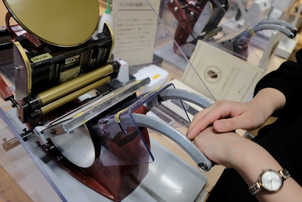 しおりの紙をセットして、ハンドルを倒すとインクの付いたロールが回って印刷される仕組み。