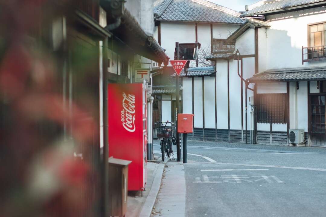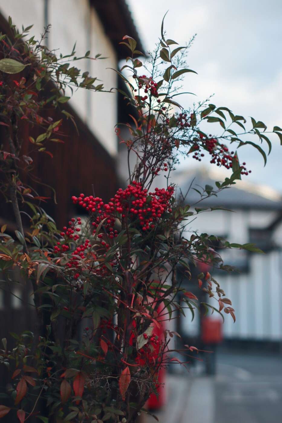 赤いポスト、赤い自動販売機、南天の木、止まれの標識。