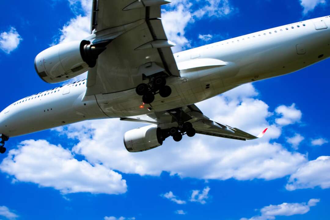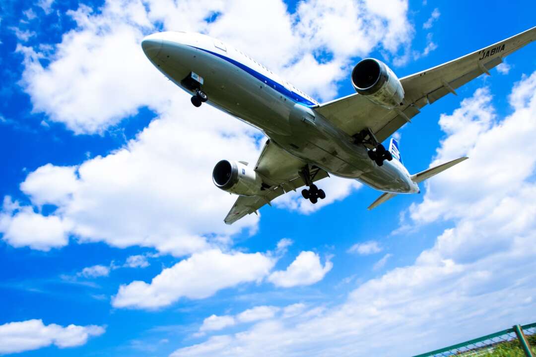斜めに下りてくる飛行機を間近で