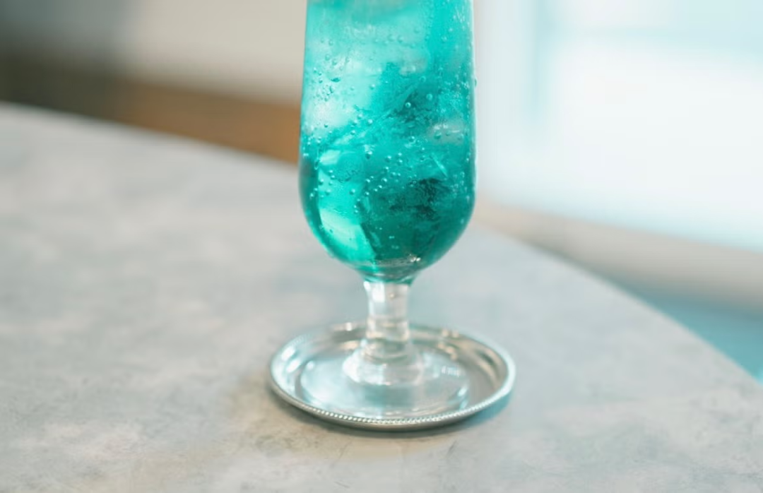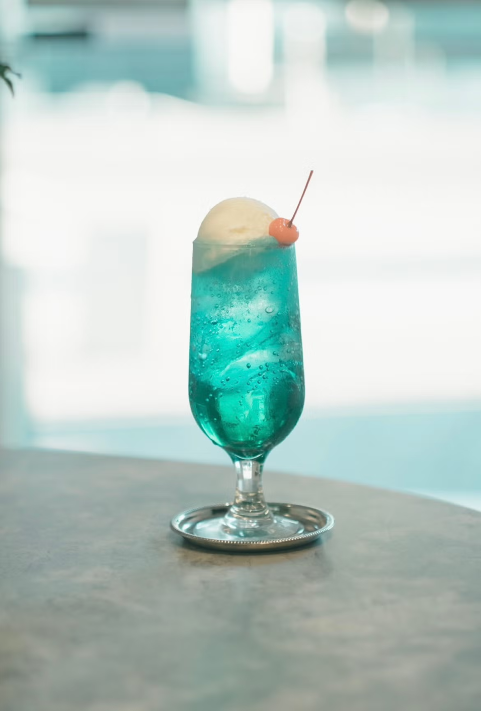 わたしが頼んだのは塩釜クリームソーダ。普通の緑色ではなくて、深い青緑色で偶然にもわたしが好きな色…!光に当たるとキラキラしててとってもきれい。