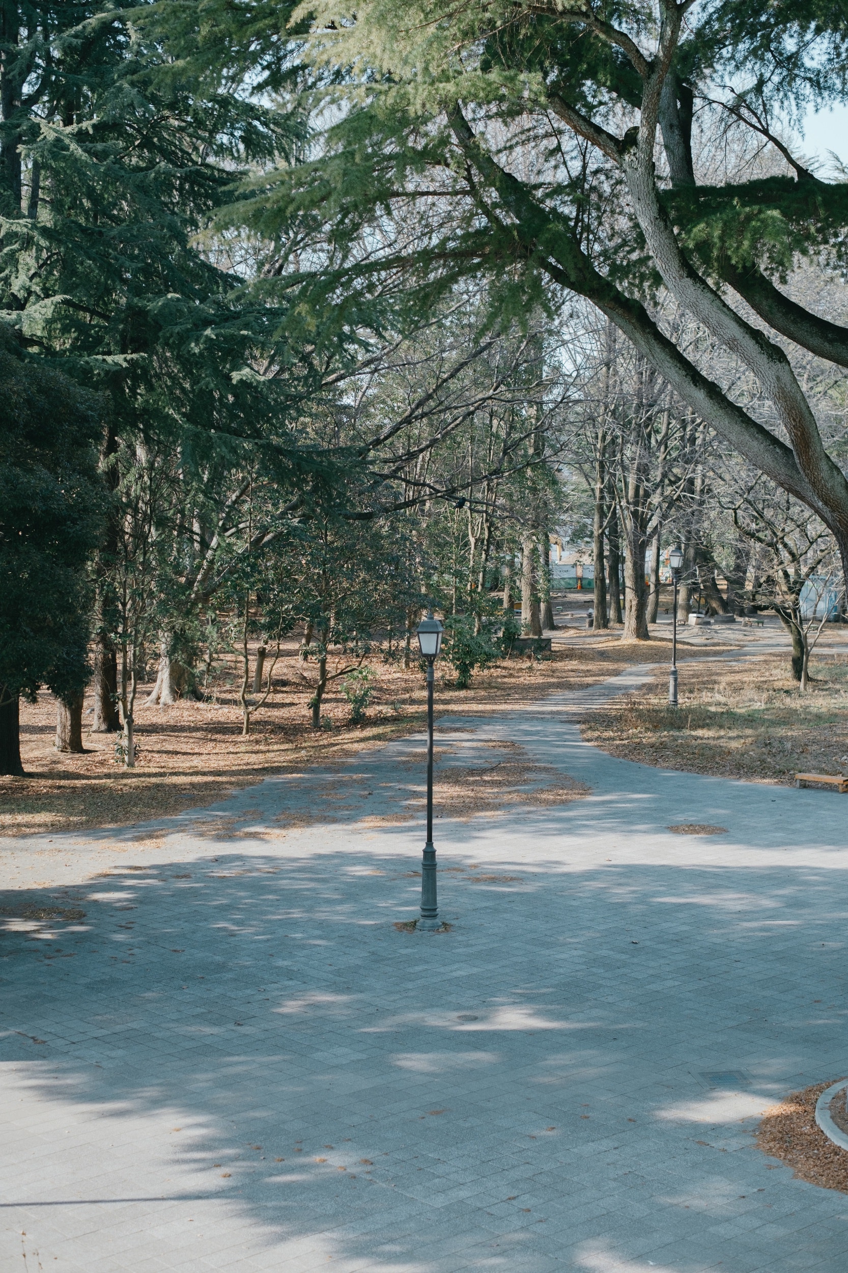 ポツンと街灯があって、そこに木漏れ日が覆っている。