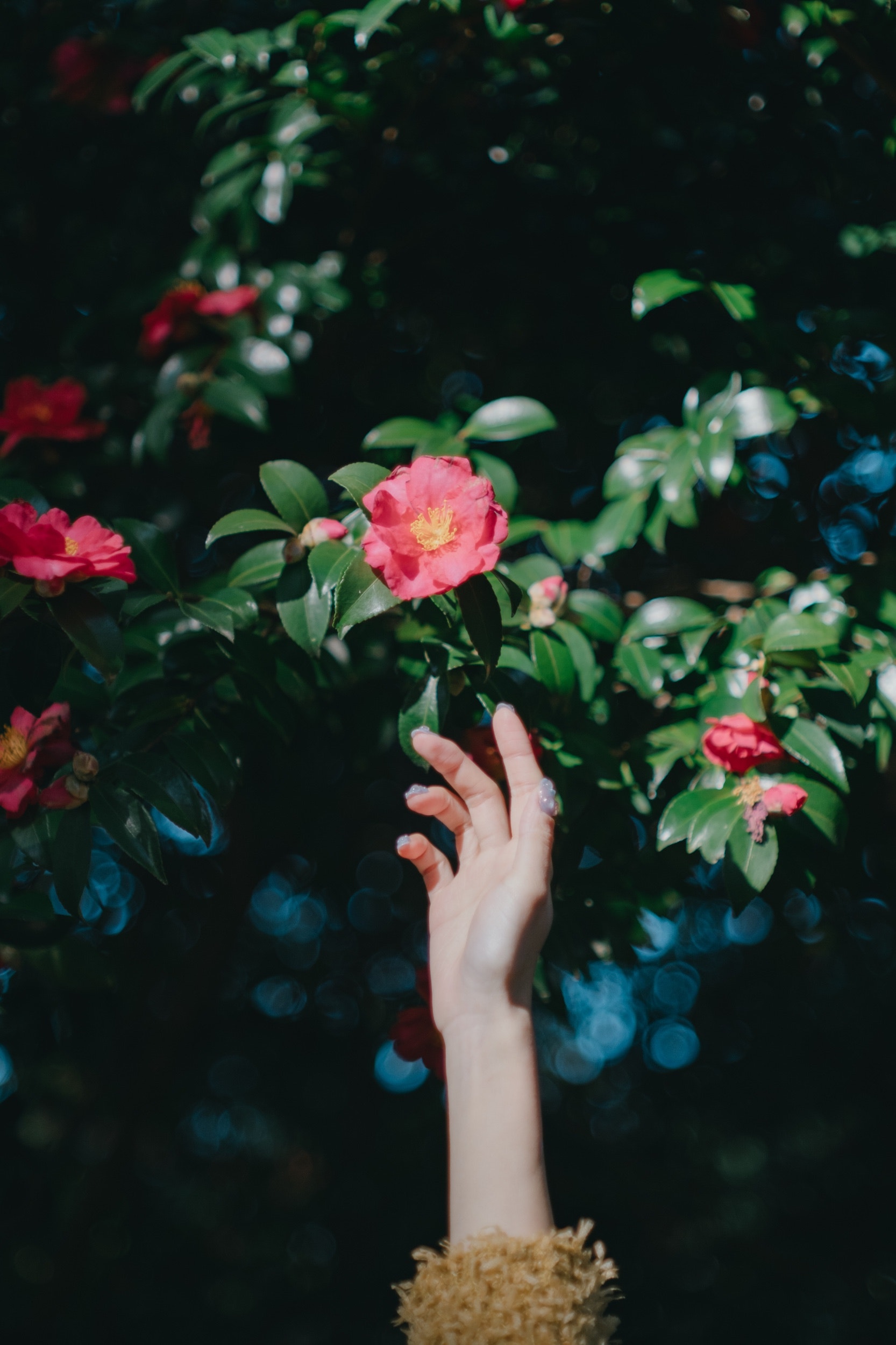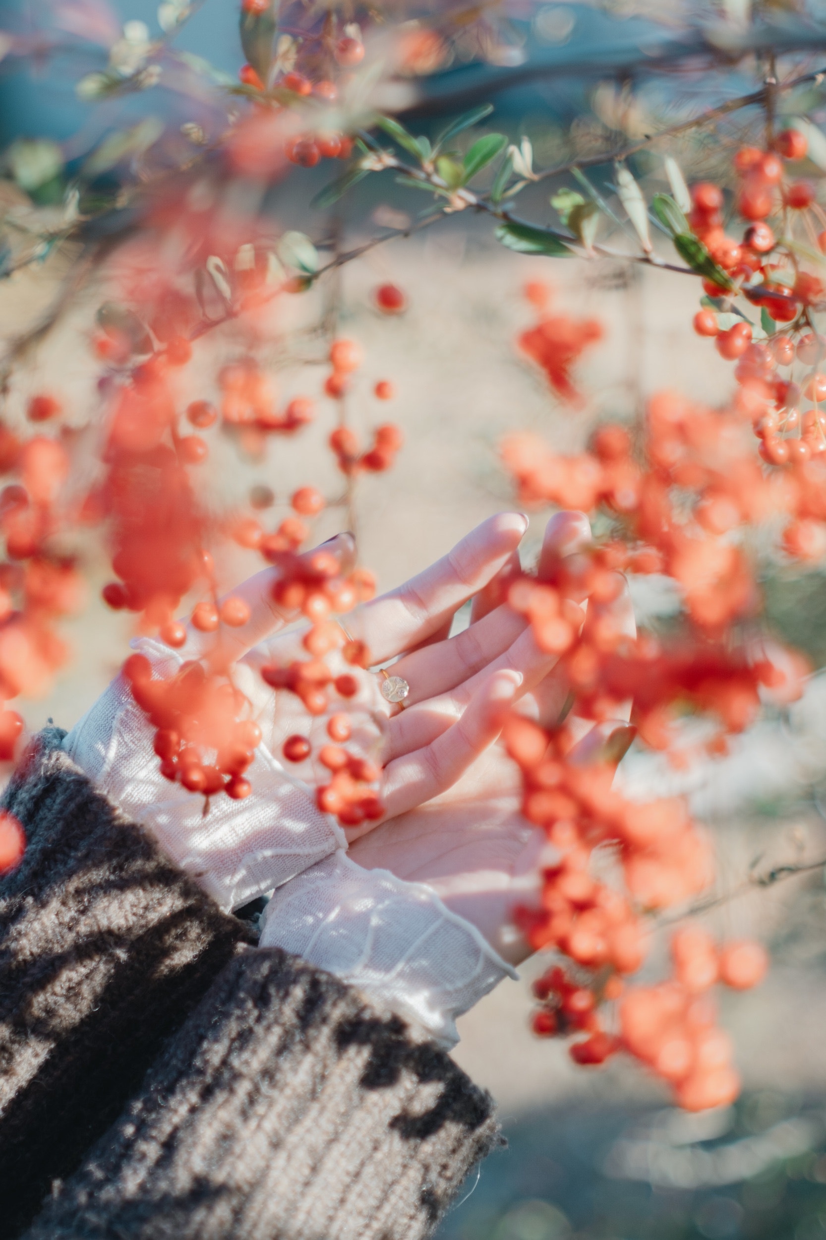 手を伸ばすと柔らかな光が生み出すピラカンサの影。