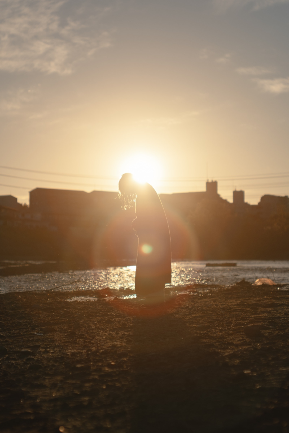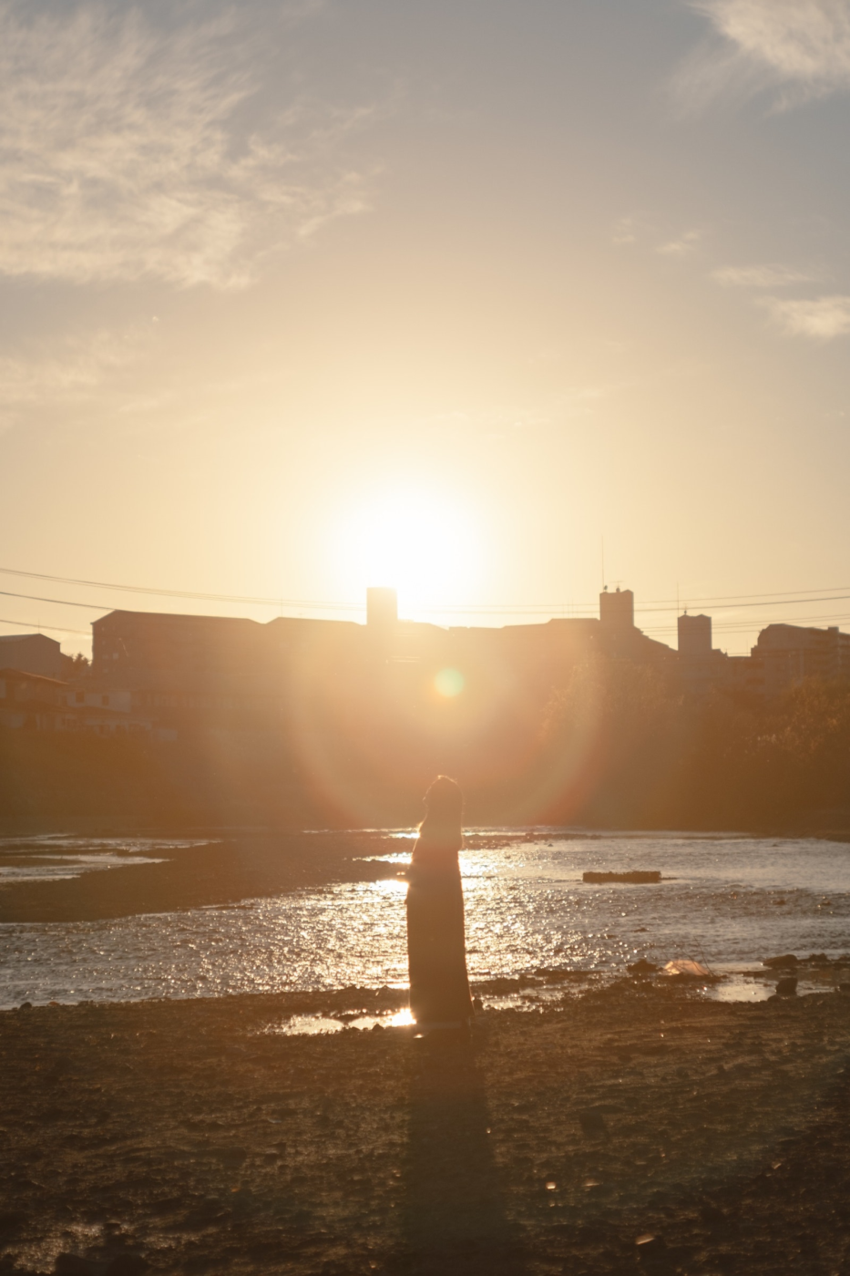 夕日の光に河辺の水が反射してきらきらと光る。