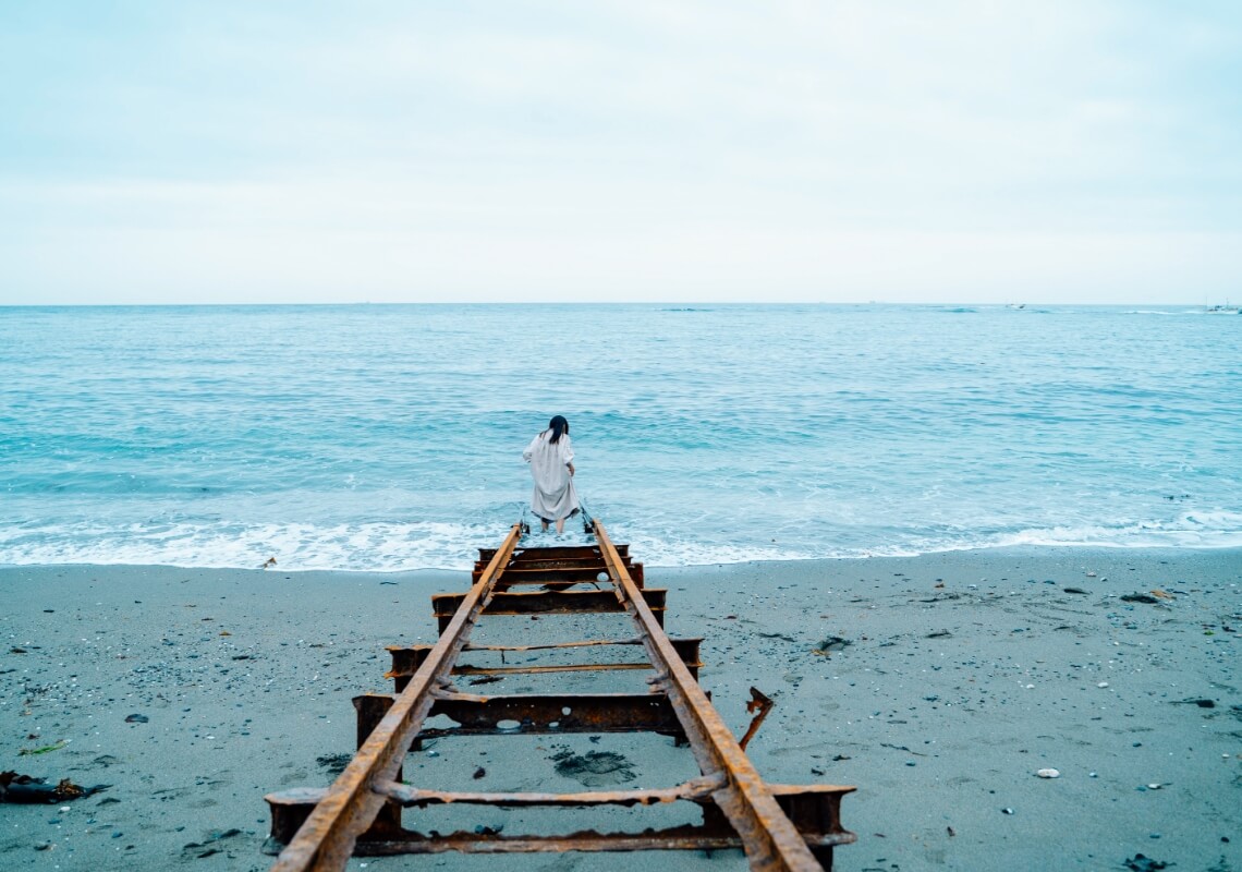 周辺には何もなく、海へと続く線路が印象的なフォトスポット。鋼のレールと鉄製の枕木で造られている線路は、造船所で作った漁船を運び出したり修理する船を搬入するために設置されたものなんだそう。線路には所有者がいるので、ご迷惑のかからないように注意してくださいね。また、向かう道は狭い箇所もあるので、地元の車優先で安全運転でお願いします!