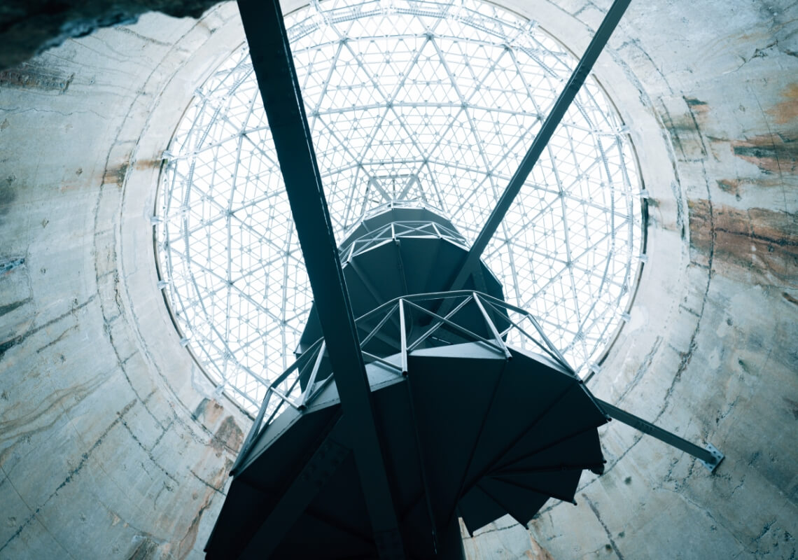 美しい海を臨むことができるこの場所は、豊後水道を守るため豊予要塞の一つとして設置された丹賀砲台の跡です。メインの丹賀ドームの中は廃墟のようになっていて迫力満点!螺旋階段と天井のガラスドームも印象的です。ひんやりと感じる白壁の地下通路には当時の資料が掛けられており、その頃のことを知ることができます。