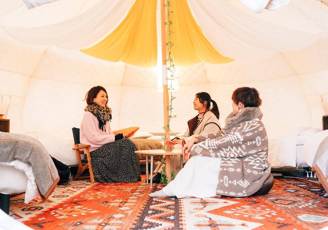 ロータスベルテントとドーム型の2種類のグランピングテント、天然温泉、ホテル並みのアメニティ、マルシェで選んだ野菜や地元の新鮮食材を使った美味しい食事という、贅沢で大満足のグランピングが楽しめます。しかも1日2組限定のドーム型テントは温泉付き!さすが『おんせん県おおいた』です。